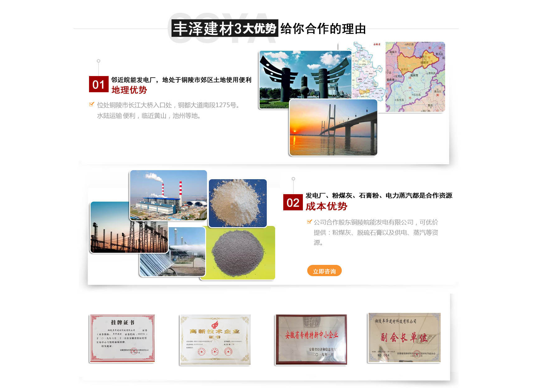 銅陵豐澤建材科技有限公司成立于2007年2月,坐落于銅都大道南段,占地4萬平方米,公司注冊資金1000萬元,現有職工百余人,是一家與皖能發(fā)電公司合作,專業(yè)從事電廠粉煤灰開發(fā)利用的高新科技企業(yè),現擁有一條年產30萬立方米蒸壓加氣混凝土全自動生產線。 蒸壓加氣混領土(英文名Autoclaved aerated comcrete),也稱AAC,是以砂、粉煤灰等硅質材料和石灰、水泥等鈣質材料為主要原料,摻加鋁粉為發(fā)氣劑,進行生產的新型墻體材料。是我國推廣應用最早,使用最廣泛,技術最完整的輕質保溫墻體材料之一,自問世以來,始終方興未艾,備受推崇。